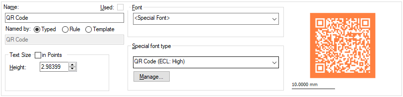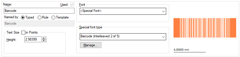 Use the Manage dialog to define the detail for these special fonts. There are two barcode font types and four QR code font types available. By selecting your font type, will determine the parameters available in the Special Font Parameters dialog.