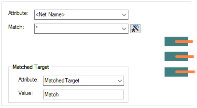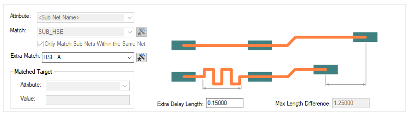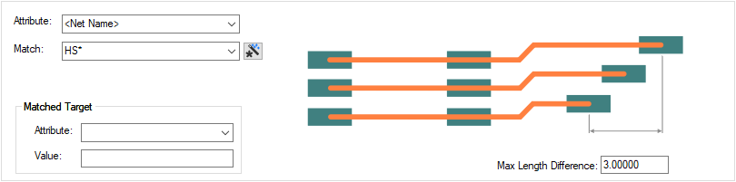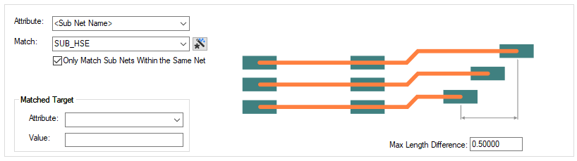 Under Matched Target, you can define a Net Attribute and Value that can be assigned to a net and used on a Net that should be matched when using the Track Length Match rule. This value can be overridden in the Rules Spreadsheet Options using the Use Match Target Attribute. Without this rule defined, any net can be nominated as the Matched Target in the Rules Spreadsheet.