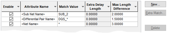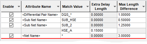 In the example above for Net Name HSE\*, the ‘group’ length match is specified but the group also includes extra matches for both CLK and RST. However, as well as RST being included in the group, it also has a value specified for an additional delay length.