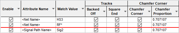 The appropriate track RF rule is found for each net by working down the list of rules until the first match is found. Hence, the order of the rules is important. A match is when the specified Attribute Name and Match Value match attributes of a net. So the net must have the given attribute, and it’s value must wildcard match the value. In particular, you can match the inbuilt attributes <Net Class Name> or <Net Name>.
