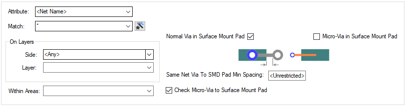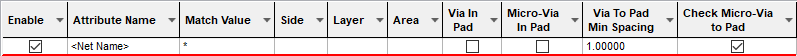 The appropriate via rule is found for each net or pad by working down the list of rules until the first match is found. Hence, the order of the rules is important. A match is when the specified Attribute Name and Match Value match attributes of a net or pad. So the pad (or net) must have the given attribute, and it’s value must wildcard match the value.