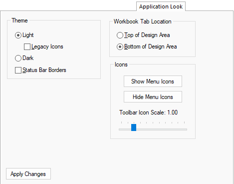 The Application Look enables you to change the look of the Theme, the interface (Light or Dark mode), the use of Legacy Icons, icon reveal on menus and Icon Scale.