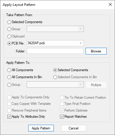 - All Components - Apply the pattern to all components in the design. Use this when you are creating a PCB design that is very similar to an already completed design.