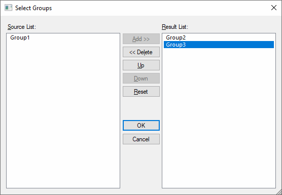 Use the Add button to add groups to the Result List (or double click on the Source List). You can change the order of the Result List using the Up and Down buttons. The order of the list determines the order they will be arranged.