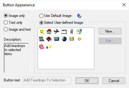 - Button Appearance - Displays a dialog to control the appearance of the button. It allows you to select a new image for the button or define your own button image. This dialog is described in more detail later in this help.