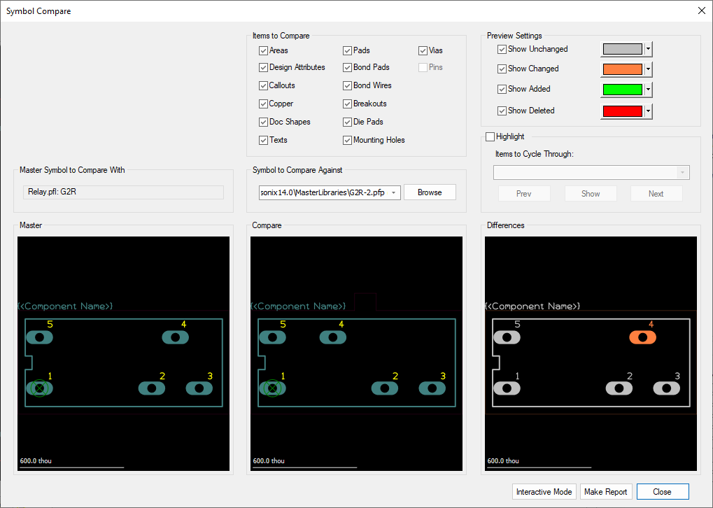 From the Symbol or Footprint Editor, the item currently open is considered the ‘Master’ file. Choose the Compare Against option from the Tools menu.