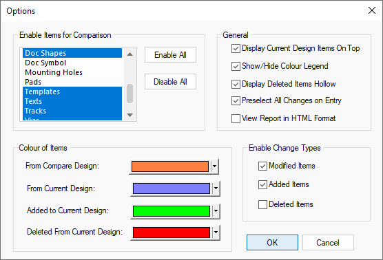 If a modal cursor appears when hovering over an item, it means it’s either been added to or changed in the Master design. If the item has been changed, it will appear alongside a copy of it from the Other design, both in unique colours, allowing you to visually check for any changes. However, if the position has not changed, they will be drawn on top of each other, but you can set which one should appear on top from the Options in the Context Menu . If the item has been added to the Master design, it will appear in it’s own unique colour too.