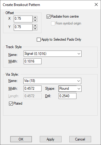 Select the Track Style to use for the breakout. Then select the Via Style, only pad styles defined as suitable for vias are shown. Usually you would select a style already defined in the technology.