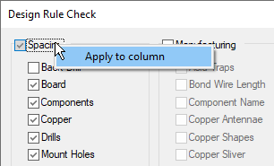 Use the check box next to the Spacing title to choose whether any checks on the space between items will be performed. Then, if spacing checks are required, choose which types of items you wish to perform spacing checks on. Selected item types will be checked against all other items in the design in accordance with the Spacing Rules defined in the Design’s Technology data.