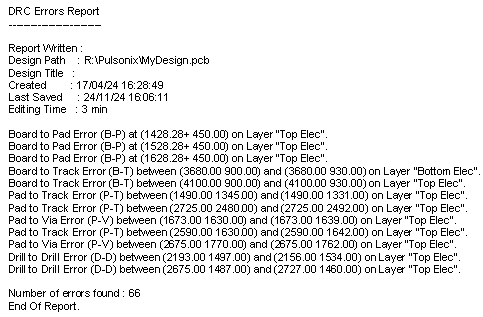 The format of the report starts with a header block giving information about the design file, followed by a list of all the errors found. Each error is described by type, location and layer. The report ends with a count of the errors found. Here is an example report:-