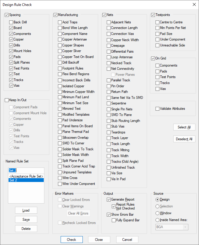 Adjacent Nets - Checks for adjacent net rules as defined in the Adjacent Nets page of the Technology dialog. This is a more specialised check where nets close to each other need to be checked and reported.
