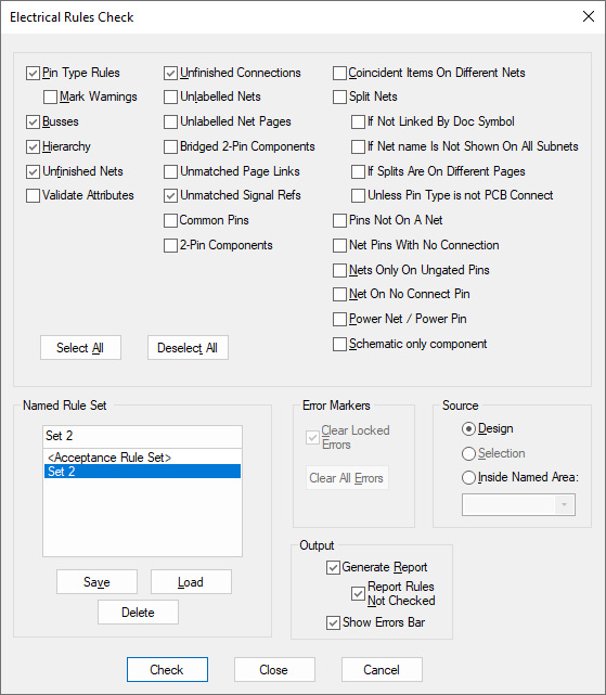 Check the Generate Report box to produce a report of all Errors Markers that are generated by this Electrical Rules Check session. Errors Markers that were already in the design prior to this session will not be included.