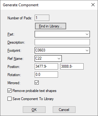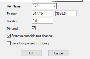 If the data came from a Gerber file, then shapes which look like text will simply be shapes, select the Remove Probable Text Shapes option to automatically delete these. This will use the default text style for symbol names, and causes any selected shape that is ‘small’ (extents smaller than the text style height) to be deleted rather than being included in the new symbol.