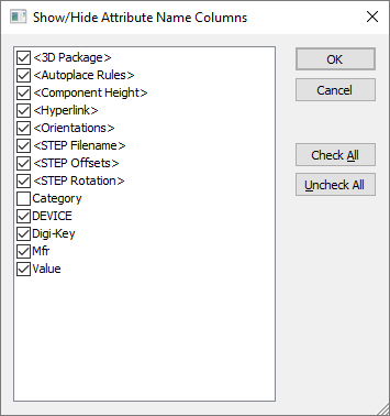 This dialog presents you with relevant Attribute Names in the design. By default, and on the initial running of the dialog, all Attribute Names are selected to be shown in the editor you are using.