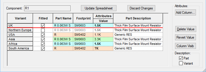 Attribute Editor | Part Editor Attributes Page | Component Variant Spreadsheet