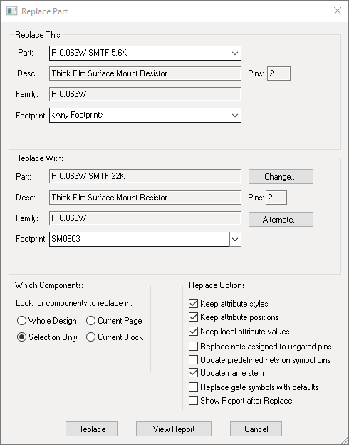 Firstly, you need to define which part you wish to replace in the Replace This section. Select the required part from the list parts in the current design. You can replace all instances of this part, or just those using a particular footprint by selecting that Footprint from the list, or by Part Representation (if there is more than one representation). If you have an instance of the part selected you can choose to replace just the selected instances (Selection Only or all instances (Whole Design) in the Which Components section.