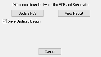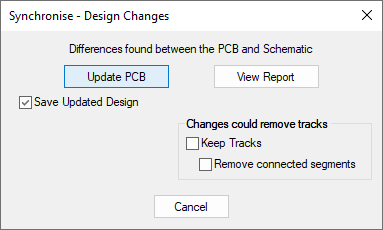 This option is available in both Schematics and PCB, and can compare and make changes in the corresponding design. You can use Synchronise Designs at any time to verify that the netlists are the same. If there are differences, a dialog will appear, allowing you to view a report and perform an update. The report will give you a list of changes which would have to be made to the PCB or Schematic in order to make them match. You can then perform these changes automatically by selecting the Update PCB or Update Schematic option.