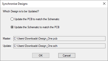 If the Allow Update of Schematic to match PCB setting is enabled, the following dialog will be the next stage in the Synchronise Designs procedure. Specify which way the changes are to be applied by selecting which design is to be updated. When you update the designs, the Safe Mode options will be adjusted if necessary, to reflect the direction of the update selected. So the design you choose to update should be the one in safe mode.