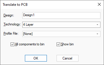 From the dialog you can make selections for Technology and Profile files as well as the location of the placement of the components once in the PCB design.
