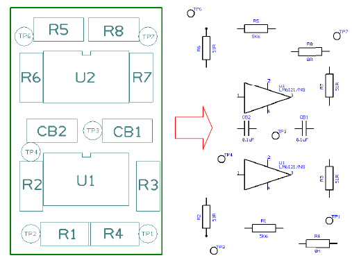 The above illustration shows a small sample PCB before, and the Schematic design after the use of Reverse Engineer and Place Components To Match PCB with the Spread Out option selected.