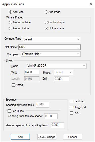 Pads added will be Free Pads on a single electrical layer and will not be on a net, this is useful for creating a thieving pattern, for example. These options also work in a footprint design, where Component Vias will be added (you cannot add free pads to a footprint).