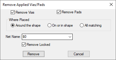 The Remove Applied Vias/Pads command removes vias or pads added by the Apply Vias/Pads Command.