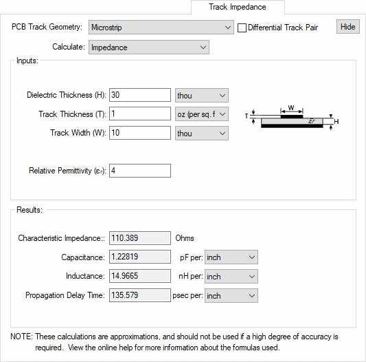 This calculator is on a tab on the Design Calculators dialog, available from the Utilities menu. The following dialog appears when the Track Impedance tab is selected.