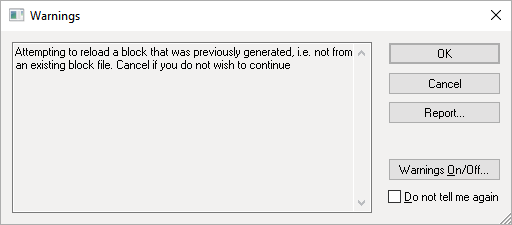 Reload Block refreshes every selected instance of the block, from the Block file previously saved in the Block Folders. If the Block was Generated when it was added (i.e. it was not read from an existing Block file), then the block name which was specified at that time, may not exist and the reload will fail. A warning message is given when this is the case.
