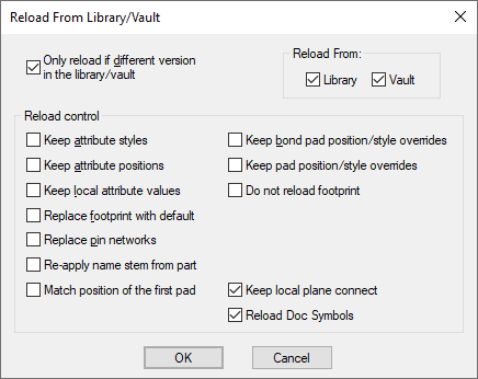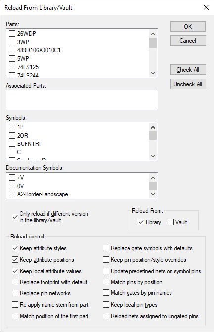 If only Library is checked, items in the design will only be replaced with items from your libraries and not the vault. Parts, whether previously from the vault or not, will be replaced by parts from the libraries with the same name. Symbols and footprints used by parts no longer from the vault will be replaced with ones from the libraries with the same name. Note that using this option can strip vault information from library items in a design and render the design unable to be Checked In to the vault.