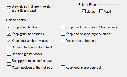 - Do not reload footprint, when checked, will prevent any footprints from being reloaded, only the part information will change. This option should be used with care because the component may not be consistent with the library.