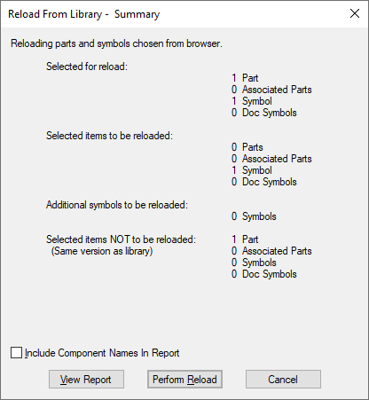 - Reload Doc Symbols, when checked, Documentation Symbols are reloaded as well as Parts and associated Symbols or Footprints. This option is only available if you a reloading All symbols.