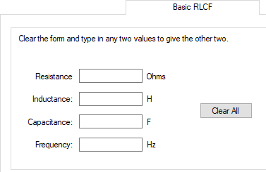 This calculator is on a tab on the Design Calculators dialog, available from the Utilities menu. The following dialog appears when the Basic RLCF tab is selected.
