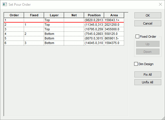 The Set Pour Order dialog is used to determine the order in which templates are poured when you use Pour copper - Apply To All. Using the dialog is an alternative to the Ordered Template Pour interactive method or the setting of pour order for individual Templates using Properties.