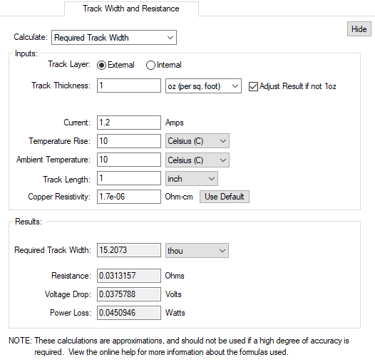 This calculator represents the relationship between the track width, the current applied to it and the temperature rise when that current is applied. Given any two of these values the third can be calculated. You can enter the track width, length and layer by picking on a track in the design.