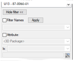 Click on the Use Filter or Change Filter button if you want to further define the search criteria and reduce the number of components to show. If a filter is currently active, then a label will appear saying Filter is active. to the right of the show/hide button. When the button is checked, a set of extra filter controls will appear to use. These are detailed below. When the Hide Filter button is used, these filter controls will disappear.