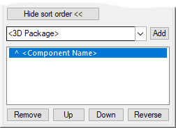 When the button is checked, a list showing the sort order, and several controls that allow you to modify it, will appear. The information shown in the sort order list is a either the ^ or the v character followed by <Attribute Name>. That line refers to the component bin being sorted based on the value of the attribute shown either in ascending ^ or descending order. Each line is applied in order running from top to bottom.