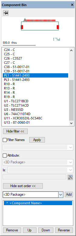 | The Component Bin is displayed as a configurable Dockable Window containing a scrollable list of the items currently stored in the bin and a preview window displaying the currently selected Component Bin item. The relative proportions of the list and the preview window may be varied by dragging the splitter bar that separates them. Items are listed by Component name, Part name, Footprint name, Symbol name, Testpoint name and net, and in Schematics, Gate name and Connector Pin name. Composite items such as Components and Connectors in Schematics are shown in the list in hierarchical form; the named item followed by a list of its subitems. Documentation Symbols, Testpoints and Connector Pins will be shown in their own subsection within the list. Where items are in a group, their group name will be shown. Single pin items in the bin that are on a net show the name of the net. This makes it easier to place the correct edge connector pin in schematics, or the correct testpoint in PCB. For example, if you run Auto Insert Testpoint in PCB and add the new testpoints to the bin. It is possible to pan and zoom in the preview window using the standard mouse wheel button functionality. Items can be both Filtered and Sorted using the additional controls provided. See below under Filter. | ![]() |