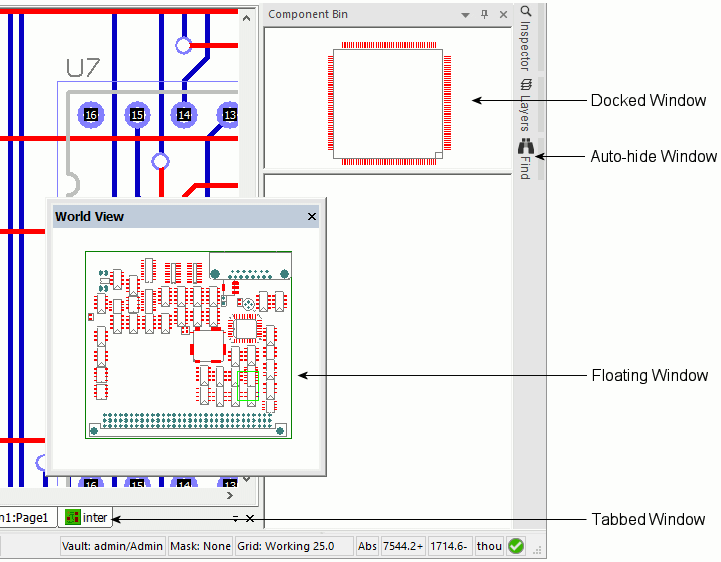 Some of the features available in Pulsonix open additional dockable windows; examples include the Component Bin and the World View. Dockable windows are completely configurable with regard to their size and position on screen and have three display modes: floating, docked or auto-hide.