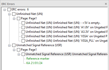 To view an error of a particular type, firstly click on the box next to ERC Errors. This will then display all the actual error types found in the design. Click on the box next to the error type that you want to look at. This will then give a list of the pages that have this error. Click on the box next to the page name. This will then list the position of all errors of this type on this page. If you then double click on one of the positions in the list, the view centre of the page will move to this position.
