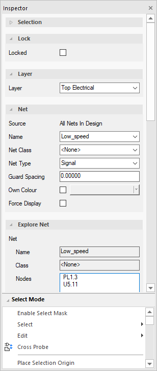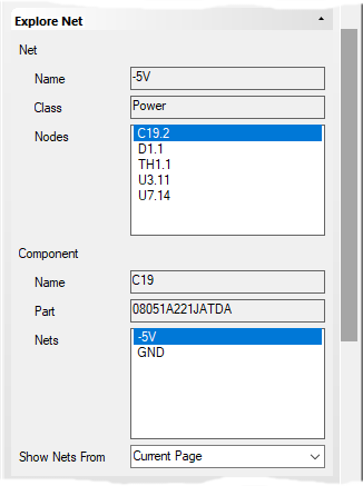 Explore Net is special group (only available on the Inspector Bar). This allows you to quickly review the connectivity of the selected items, including the ability to ‘drill down’ into this connectivity and follow its path through the various nodes on the nets involved.