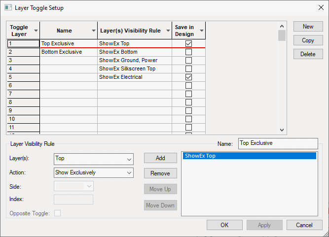 For example, defining Toggle Layer 3 as “ShowEx Electrical Top, Electrical Bottom” will allow the top and bottom electrical layers to be shown exclusively with all other layers hidden.
