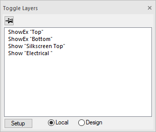 These two radio buttons are used to define where the Toggle Layer settings are used from. This means you can save specific layer combinations where layer names are unique for example, and save them with the design for use by another user. It also enables you to create your own unique local set for your own purposes, and to mix the two sets.